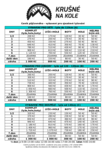 3. Při půjčení se platí za sjednanou dobu nájmu předem půjčovné v hotovosti (viz.ceníky níže) – 1/2 dne je od 9:00-12:30, 12:30-16:00 nebo 16:30 – 20:00